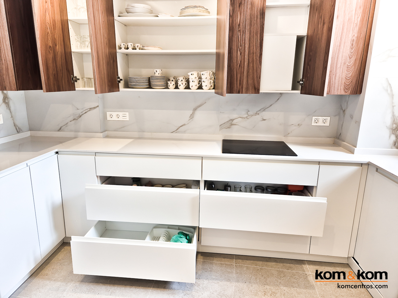 - Kom&Kom, Yecla, cocina, madera, a medida, sin tiradores, moderna, blanca, nogal, distribución U