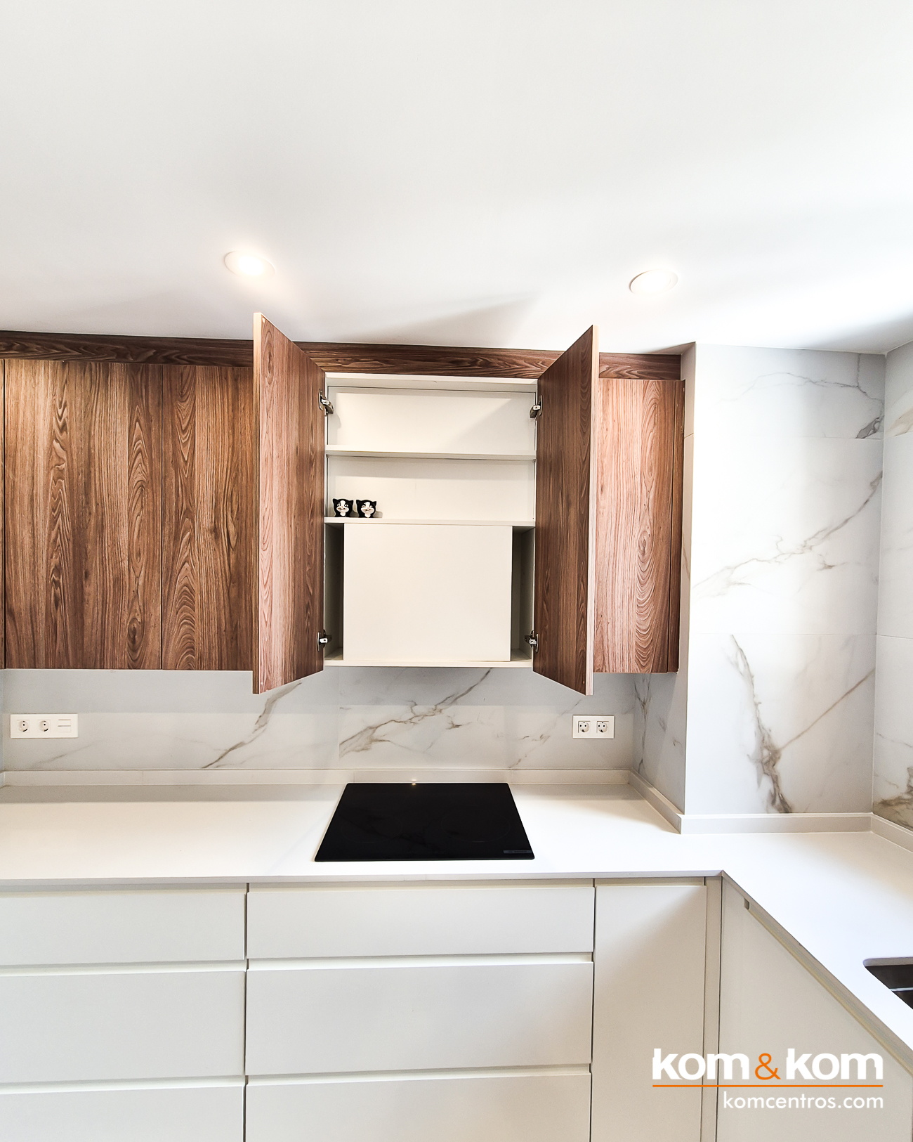 Descubre el arte de la integración con esta cocina moderna en blanco y negro. En Kom&Kom creamos diseños elegantes y funcionales con electrodomésticos ocultos, encimeras de cuarzo y soluciones inteligentes.